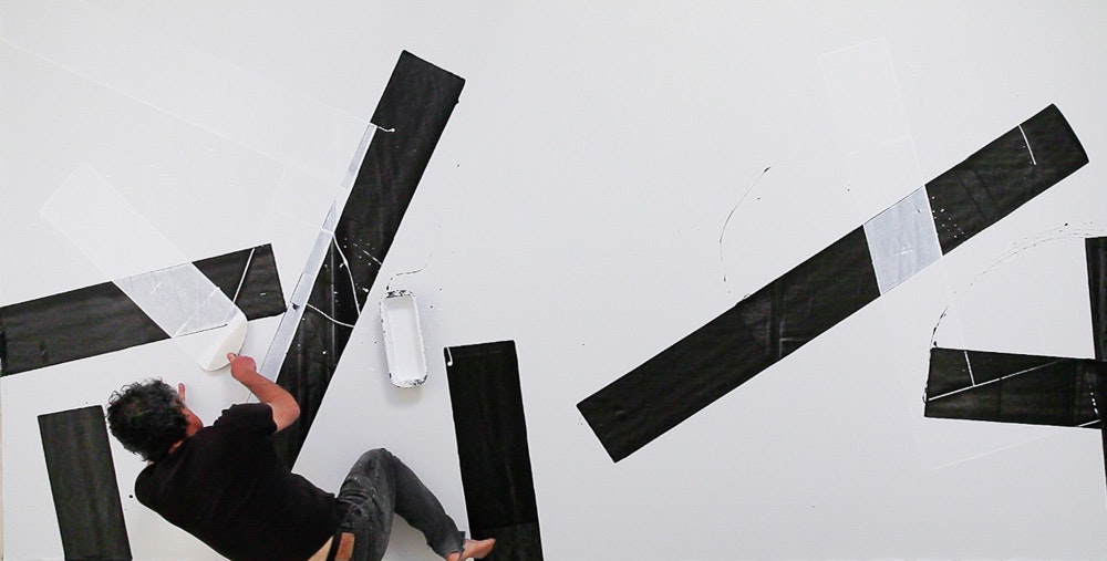 Pippo Lionni uses spackle knives to paint large-scale black and white canvasses. The recorded sounds of him painting structure the acoustic and electronic works of the musical composition. Each piece is a stratification of paint and sound layers. Thus, while the creative process is constantly evolving, the basic idea is that the painting has both a visual and audio form, and musical composition is at the same time influencing and being influenced by the painting. While there have been numerous experiences of artists painting while musicians play in the back round, Actionreaction is original because Pippo Lionni is painting and making music at the same time – the sound is the painting and the painting is the sound.